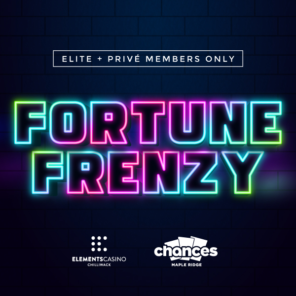 Avis à tous les membres Élite et Privé : profitez pleinement de vos week-ends au Chances Maple Ridge et au Elements Casino Chilliwack grâce à notre promotion Fortune Frenzy.
