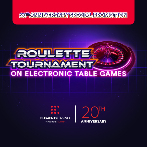 Join us as we celebrate another incredible milestone at Elements Casino Surrey with our 20th Anniversary ETG Tournament, for your chance to win a share of $10,000 in Free Play!