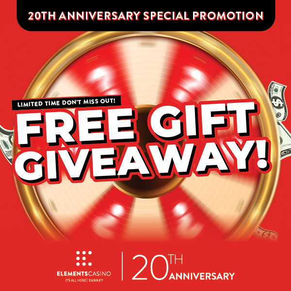 Elements Casino Surrey‘s 20th Anniversary is here, and we’re celebrating with gift giveaways for a limited period of time.