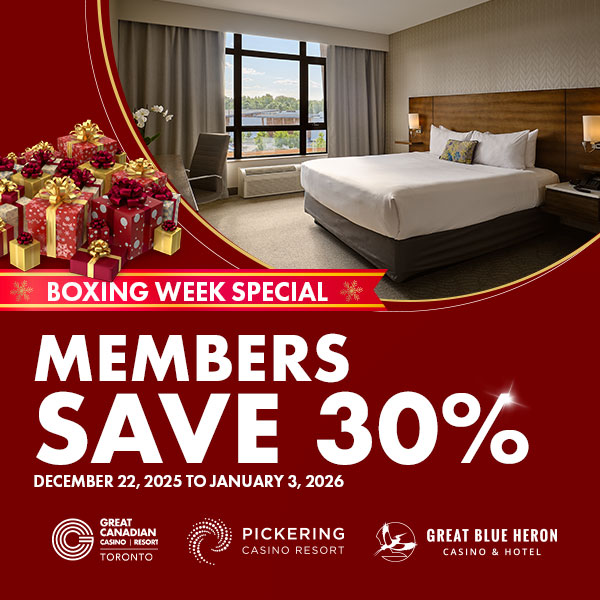 Great Canadian Rewards members can enjoy 30% off the Flexible Rate on hotel stays that take place exclusively between December 22, 2025 and January 3, 2026 at Great Canadian Casino Resort Toronto, Pickering Casino Resort, and Great Blue Heron Casino & Hotel.