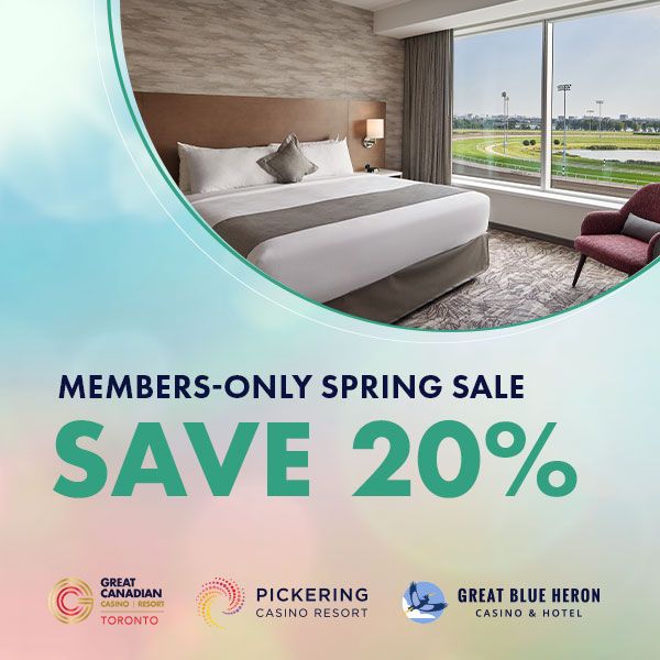 As a Great Canadian Rewards member, you’re always guaranteed the best rates with our exclusive Members-Only Spring Sale. Enjoy 20% off the Flexible Rate on stays at top destinations like Great Canadian Casino Resort Toronto, Pickering Casino Resort, and Great Blue Heron Casino & Hotel.